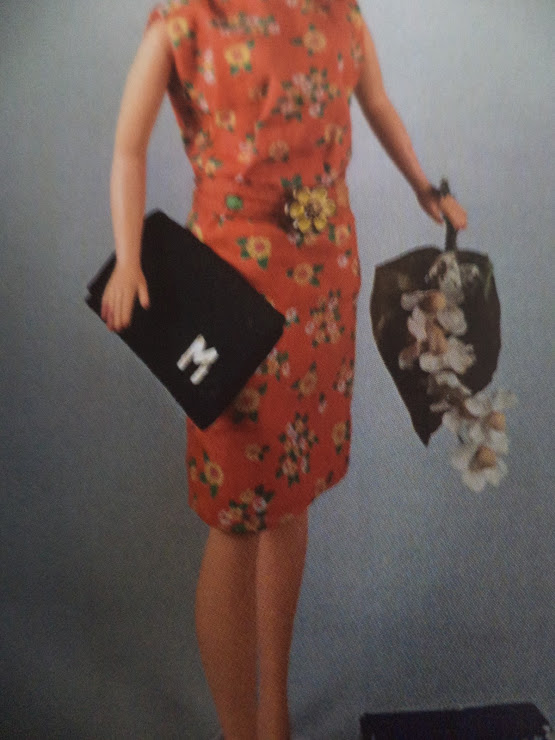 Voici un morceau d'une photo du livre de Michel Bosc, déjà on peut voir que le motif est différent. Cette robe a une ceinture et un sac. ( Et des fleurs puisque Mily est invitée à dîner...). Je n'avais rien de tout ça et ce serait un miracle de retrouver la ceinture avec le même motif! La tenue a des boucles. Soit la dite boucle est toute dorée soit verte, soit jaune. Donc j'ai fait avec les moyens du bord, une ceinture, et le sac.